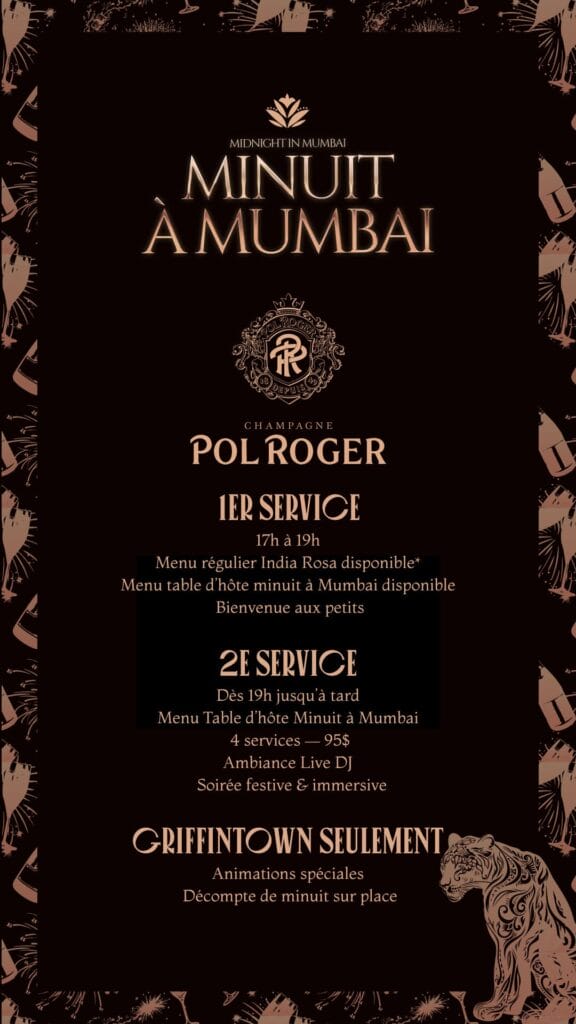 Notre menu régulier sera disponible pour tous ainsi que notre table d’hôte Minuit à Mumbaï